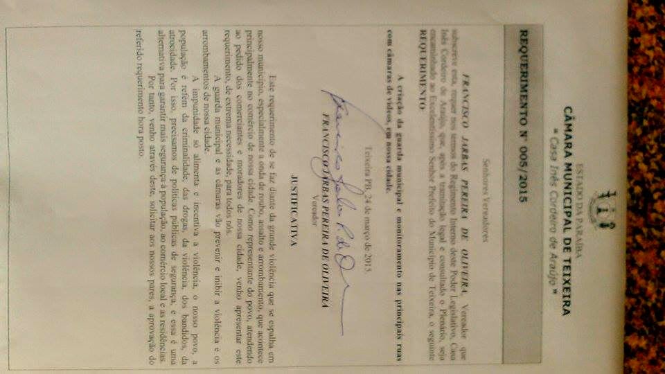 Ao fim do discurso o parlamentar apresentou, após receber o apelo dos comerciantes locais e da população em geral, um requerimento pedindo a criação de uma Guarda Municipal, com o objetivo de fazer patrulhas e coibir o alto índice de violência que vem sendo registrado na cidade nos últimos meses.